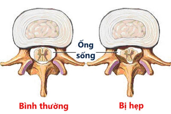 Nguyên nhân hẹp ống sống có thể do thoát vị đĩa đệm hoặc thoái hóa đốt sống, gai đôi đốt sống chèn vào ống sống.